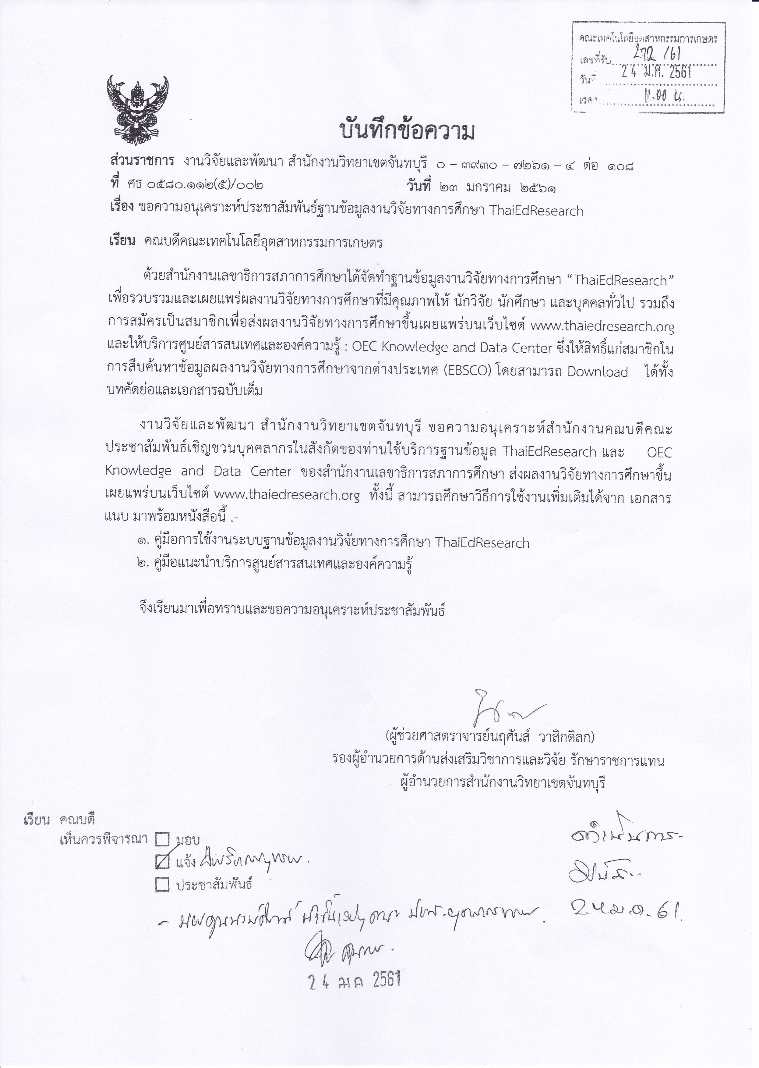 งานวิจัยและพัฒนา สำนักงานวิทยาเขตจันทบุรี ขอความอนุเคราะห์สำนักงานคณบดีคณะ ประซาสัมพันธ์เชิญขวนบุคคลากรในสังกัดของท่านใช้บริการฐานข้อมูล ThaiEdResearch และ OEC Knowledge and Data Center ของสำนักงานเลขาธิการสภาการศึกษา ส่งผลงานวิจัยทางการศึกษาขึ้น เผยแพร่บนเว็บไซต์ www.thaiedresearch.org ทั้งนี้ สามารถศึกษาวิธีการใช้งานเพิ่มเติมได้จาก เอกสาร แนบ มาพร้อมหนังสือนี้ .-