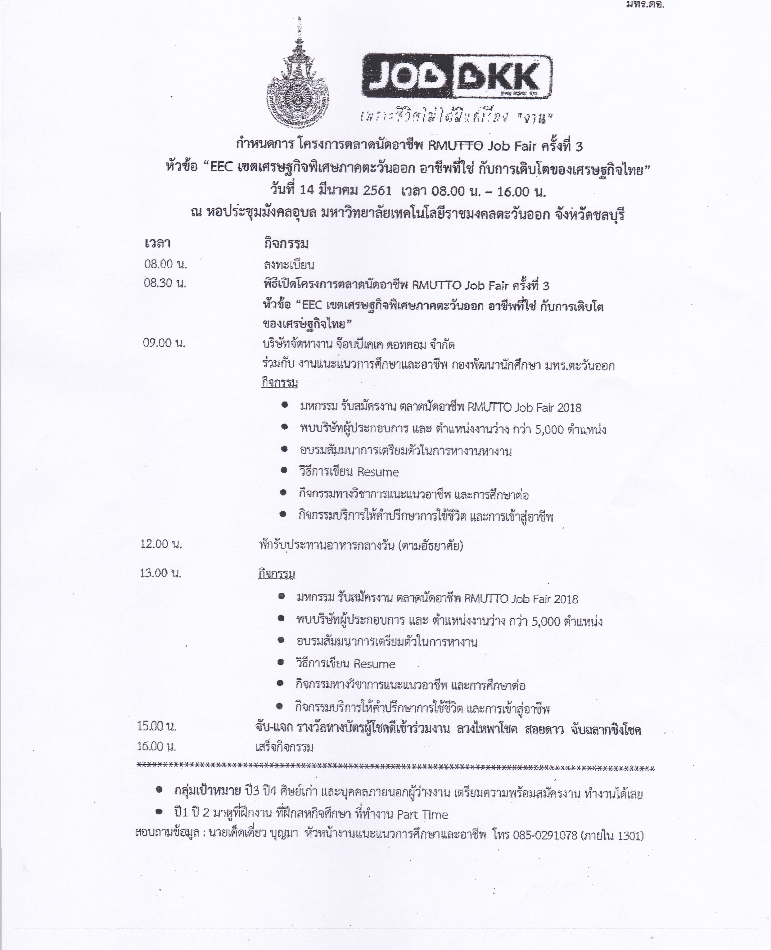 ตามที่กองพัฒนานักศึกษา มหาวิทยาลัยเทคโนโลยีราชมงคลตะวันออก ร่วมกับบริษัท จัดหางาน จ๊อบบีเคเค ดอทคอม จำกัด ได้รับอนุมัติดำเนินโครงการตลาดนัดอาชีพ RMUTTO Job Fair ครั้งที่ 3 หัวข้อ "EEC เขตเศรษฐกิจพิเศษภาคตะวันออก อาชีพที่ใช่ กับการเติบโตของเศรษฐกิจไทย" โดยมี วัตถุประสงค์เพื่อให้ความรู้และเป็นสื่อกลางในการรับสมัครงานและจ้างงานระหว่างนักศึกษาและ บริษัทเอกชน และตอบสนองความต้องการของนักศึกษาที่กำลังจะสำเร็จการศึกษา โดยมีกลุ่มเป้าหมายเป็น นักศึกษาชั้นปีที่ 3 และ 4 และสอดคล้องกับการประกันคุณภาพการศึกษา ตัวบ่งชี้ที่ 1.5 การบริการ นักศึกษาระดับปริญญาตรีในการจัดกิจกรรมการเข้าสู่อาชีพและเตรียมความพร้อมเพื่อการทำงานเมื่อสำเร็จ การศึกษาแก่นักศึกษา นั้น