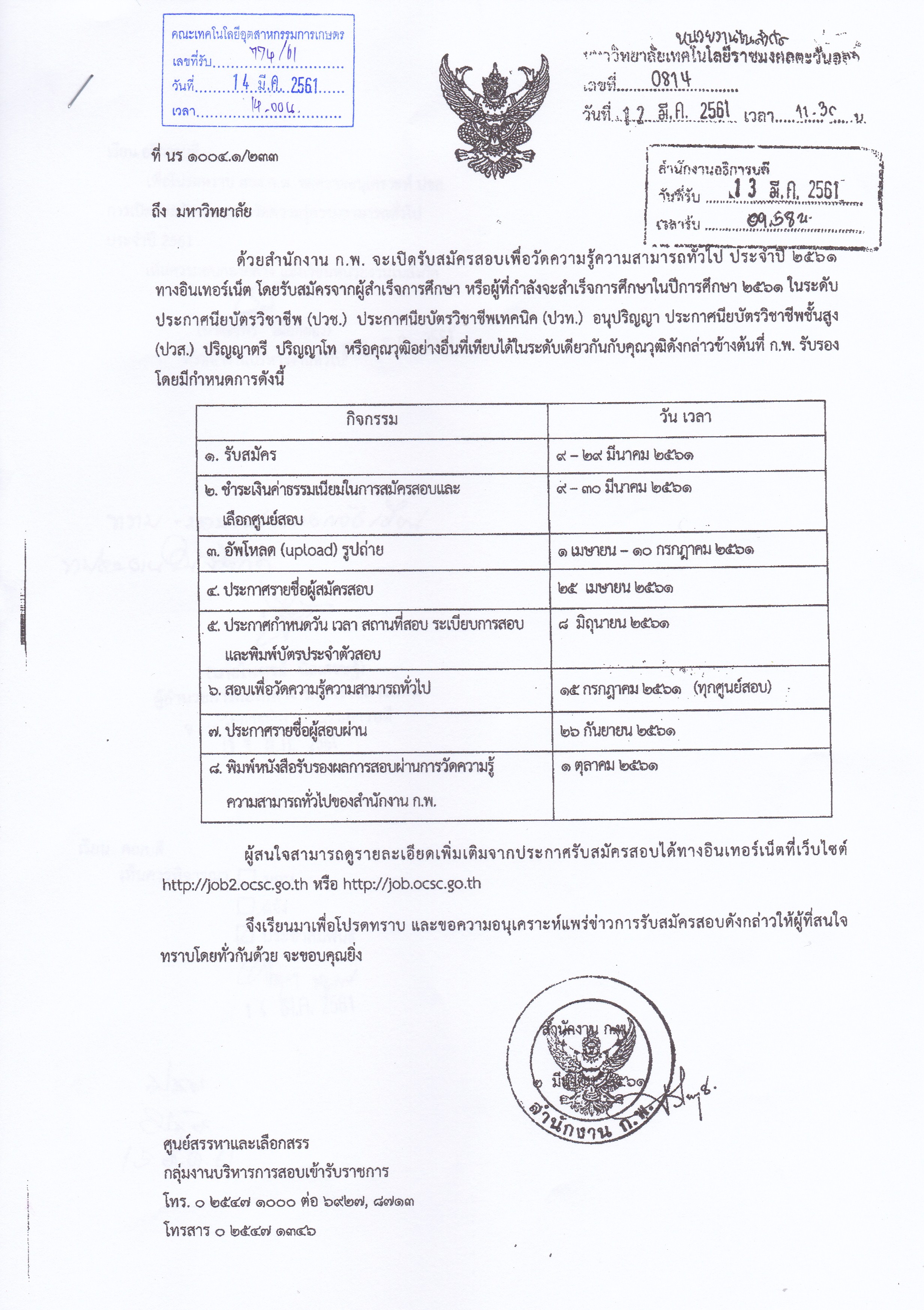ด้วยลำนักงาน ก.พ. จะเปิดรับสมัครสอบเพื่อวัดความรู้ความสามารถทั่วไปประจำปี 2561 ทางอินเทอร์เน็ต โดยรับสมัครจากผู้สำเร็จการศึกษา หรือผู้ที่กำลังจะสำเร็จการศึกษาในปีการศึกษา 2561 ในระดับ ประกาศนียบัตรวิชาชีพ (ปวช.) ประกาศนียบัตรวิชาชีพเทคนิค (ปวท.) อนุปริญญา ประกาศนียบัตรวิชาเพชั้นสูง (ปวส.) ปริญญาตรี ปริญญาโท หรือคุณวุฒิอย่างอื่นที่เทียบได้ในระดับเดียวกันกับคุณวุฒิดังกล่าวข้างต้นที่ ก.พ. รับรอง โดยมีกำหนดการดังนี้