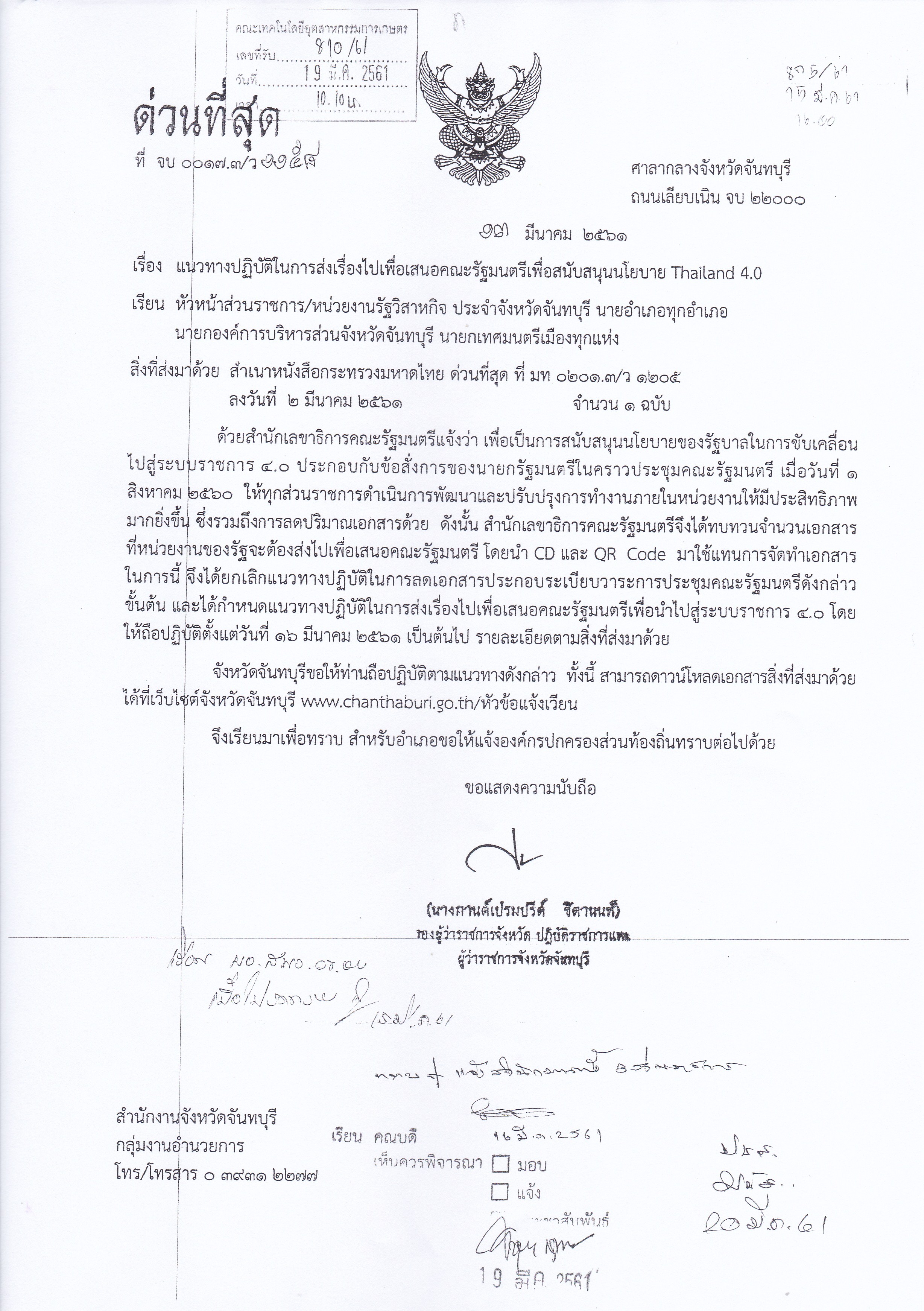 จังหวัดจันทบุรีขอให้ท่านถือปฏิบัติตามแนวทางดังกล่าว ทั้งนี้ สามารถดาวนํโหลดเอกสารสิ่งที่ส่งมาด้วย ได้ที่เว็บไซต์จังหวัดจันทบุรี https://www.chanthaburi.go.th/new/wp-content/uploads/2015/07/thailand-4.0.pdf