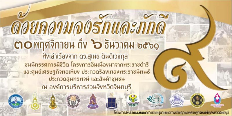 องค์การบริหารส่วนจังหวัดจันทบุรี ร่วมกับมหาวิทยาลัยเกษตรศาสตร์จัดกิจกรรม นิทรรศการ “ด้วยความจงรักและภักดี” เพื่อน้อมรำลึกถึงพระบาทสมเด็จพระปรมินทรมหาภูมิพลอดุลยเดช บรมนาถบพิตร และน้อมนำหลักปรัชญาเศรษฐกิจพอเพียง มาเป็นแนวทางในการดำเนินการขยายผลงานโครงการอันเนื่องมาจากพระราชดำริ เพื่อให้เกิดความมั่นคง มั่งคั่ง และยั่งยืน กับภาครัฐ ภาคเอกชน เยาวชน และประชาชนในพื้นที่จังหวัดจันทบุรี