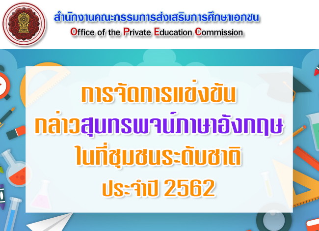 โครงการฝึกอบรมเชิงปฏิบัติการและการแข่งขันกล่าวสุนทรพจน์ภาษาอังกฤษในที่ชุมชนระดับชาติ ประจำปี 2562 ระหว่างวันที่ 19-20 มกราคม 2562 ณ โรงแรม เดอะ รอยัล ริเวอร์ กรุงเทพมหานคร