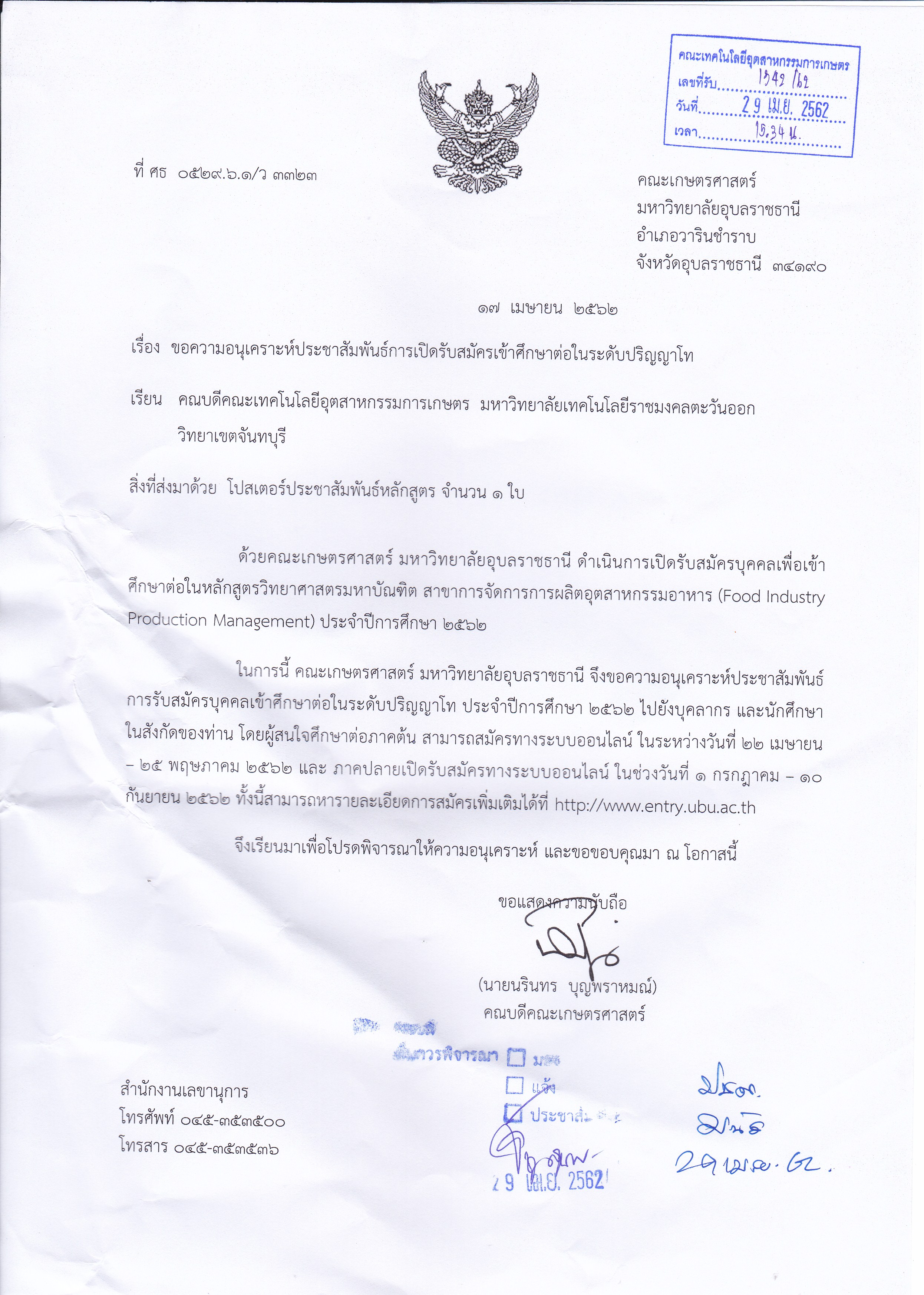 ประกาศ คณะเทคโนโลยีอุตสาหกรรมการเกษตร
